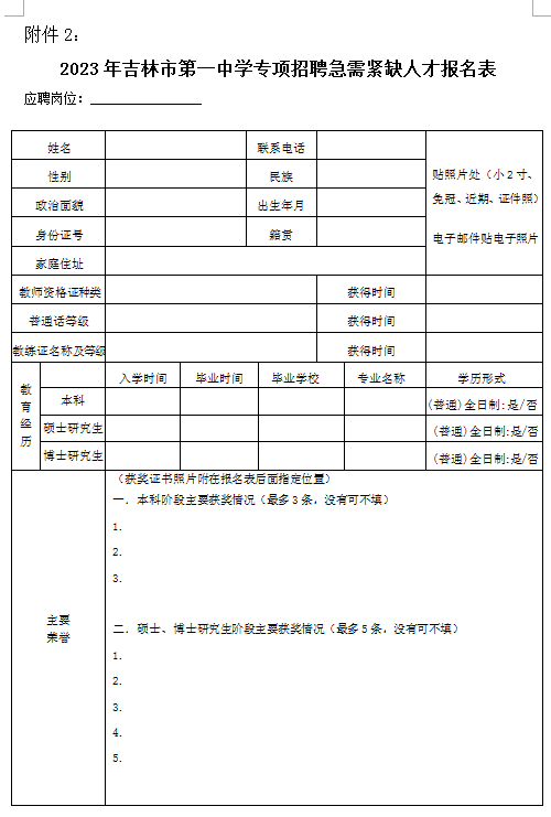2.《2023年吉林市第一中学专项招聘急需紧缺人才报名表》