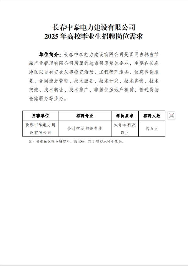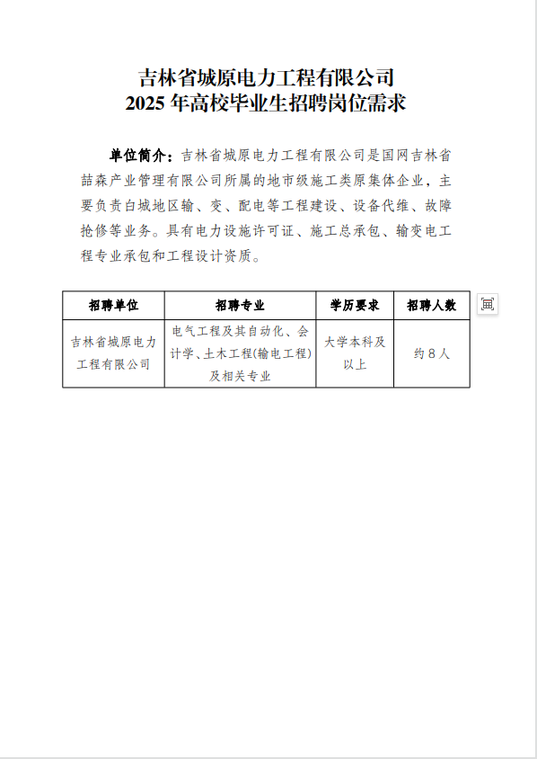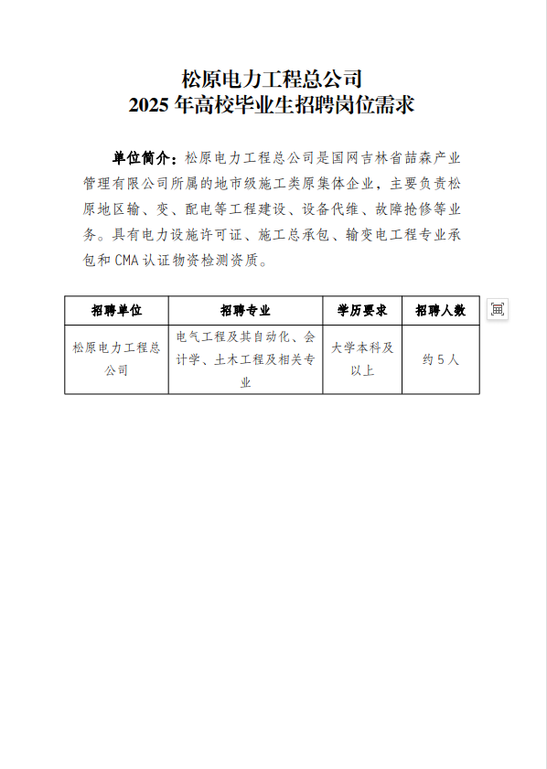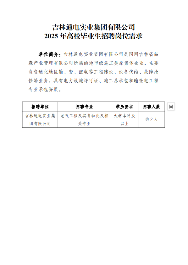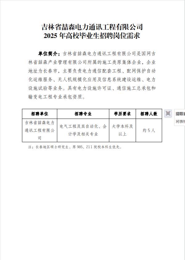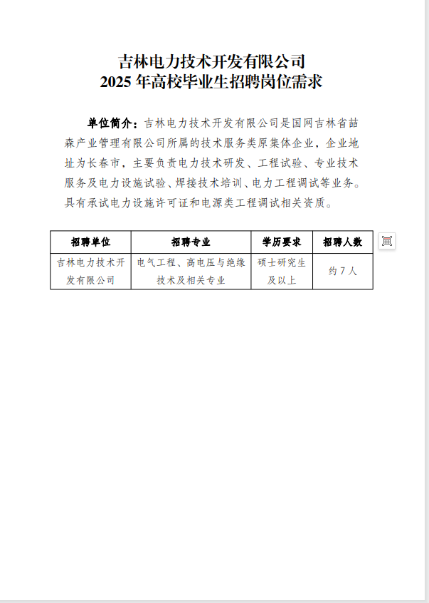 国网吉林省喆森产业管理有限公司(以下简称“喆森公司”)是国网吉林省电力有限公司的全资子公司,履行原集体企业出资人职责,对所属原集体企业进行监督管理。招聘单位均为喆森公司的全资子公司,喆森公司代为本次招聘事宜。